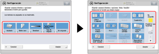 Puede guardar modos en las teclas de acceso directo que se muestran en la pantalla Copia. Puede guardar un máximo de cinco botones deseados de [Opciones] y [Opciones favoritas].