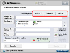 Las tres opciones de reenvío más recientes que se guardan en la memoria no se eliminan, incluso si se apaga la alimentación. Las opciones de reenvío de archivos recibidos que no se han guardado en la memoria no se muestran aunque se pulse el botón de <Opciones previas>. |