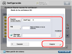 Pulse [Guardar nombre buzón] → introduzca un nombre → pulse [Aceptar].