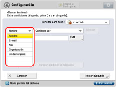 [Comienza por]: | El resultado debe empezar por las mismas letras que el nombre, la dirección de correo electrónico, el número de fax, la organización o la unidad de organización que se haya introducido. |