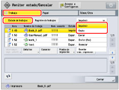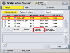 Cuando la muestra sale, el equipo procesa automáticamente el trabajo de impresión. Si necesita ajustar las opciones, pulse [Cancelar] o [Pausar todos trab. impresión] y después realice los ajustes necesarios. |