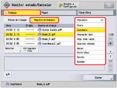 Puede imprimir listas de estados de trabajos para trabajos de Enviar/Enviar (Fax) además de listas de registro de trabajos. Para imprimir listas de estados de trabajos, seleccione [Enviar] o [Enviar (fax)] de la lista desplegable → pulse [Imprimir lista]. |