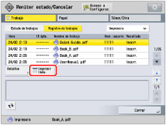 Para información acerca de las opciones para imprimir listas de trabajos, consulte "Imprimir informes". Para más información acerca de cómo imprimir listas de registro de trabajos, consulte "LISTA DE REGISTRO DE IMPRESIÓN","INFORME DE GESTIÓN DE COMUNICACIONES DE TX/RX", o "Informe de almacenamiento". Para más información acerca de cómo imprimir listas de estados de trabajos, consulte "LISTA DE TRABAJOS DE ENVÍO". |