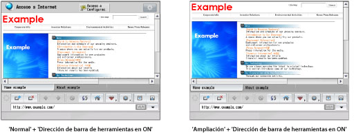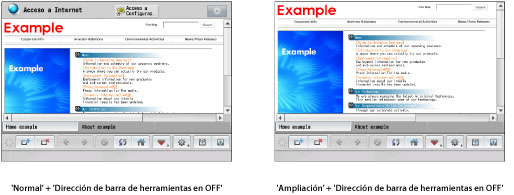 Puede cambiar el aspecto de la pantalla Acceso a Internet según sus necesidades. Existen cuatro tipos de pantalla qué se pueden crear con distintas combinaciones de opciones de tamaño de pantalla y mostrar/ocultar la barra de direcciones.