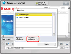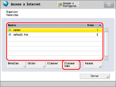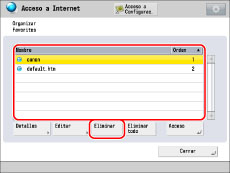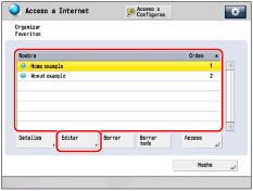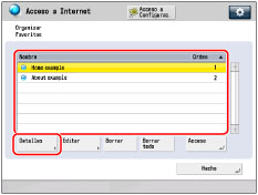 Pulse [Nombre] u [Orden] para clasificar la lista de Favoritos en orden ascendente o descendente. Los botones de la pantalla Menú principal se eliminan o se cambia su nombre si elimina o cambia el nombre de las páginas web correspondientes. Los saltos de línea utilizados al registrar las páginas Web se muestran en el nombre de los botones de página Web en la pantalla del menú principal. El nombre de la página Web en la lista de Favoritos se muestra en una sola línea, incluso aunque se añada un salto de línea. |