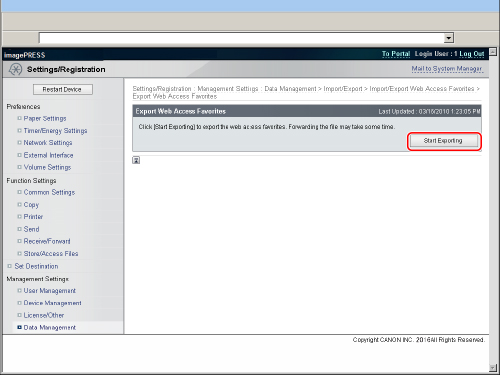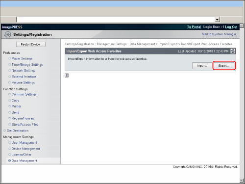 Haga clic en [Favoritos de acceso a Internet] para <Importar/Exportar individualmente> → [Exportar...].