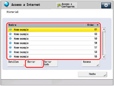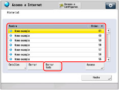 En función de la página web, el nombre puede estar en blanco. Si se muestra un archivo de imagen, el nombre se queda en blanco. Seleccione [Nombre] u [Orden] para clasificar el historial de URL en orden ascendente o descendente. |