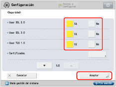 No es posible utilizar TLS si <Usar SSL 2.0>, <Usar SSL 3.0> y <Usar TLS 1.0> se establecen todas en "No". |