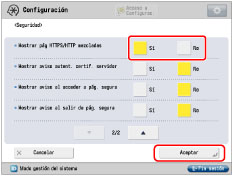 Pulse [Seguridad] → seleccione [Sí] para <Mostrar pág HTTPS/HTTP mezcladas> → pulse [Aceptar].