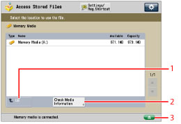 For information on the types of icons displayed for memory media, see "Types of Memory Media Icons." For the procedure regarding [Add Files (Scan and Store)] and instructions on operating the Scan screen, see "Adding a File (Scan and Store)" and "Flow of Scan and Store Operations." |