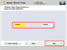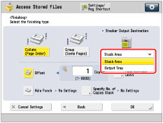 If you select [Stacker], you can change the output destination for each job to either [Stack Area] or [Output Tray]. |