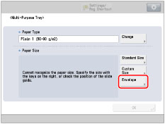 If a screen prompting you to adjust the slide guides is displayed, adjust the width of the slide guides → specify the paper size → press [OK]. ![]() If a screen prompting you to adjust the slide guides or check [Multi-Purpose Tray Defaults] in Settings/Registration is displayed, adjust the width of the slide guides to match the paper size stored in [Multi-Purpose Tray Defaults], or set [Multi-Purpose Tray Defaults] to 'Off' in [Preferences] (Settings/Registration). (See "Registering Multi-Purpose Tray Defaults.") ![]() |