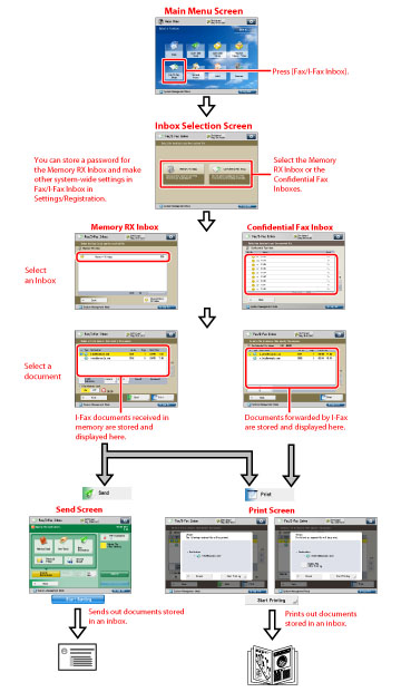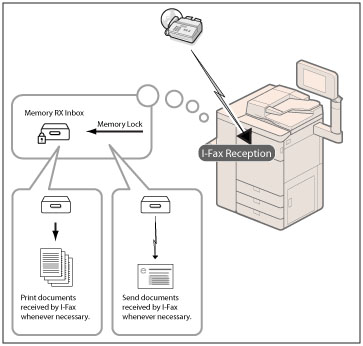 The Memory RX Inbox is an inbox for storing files received by I-Fax. Files received by I-Fax are stored in the Memory RX Inbox without being printed. You can print or send the stored files whenever necessary.