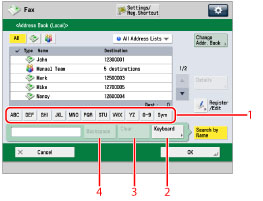 1 | Specify Type of Destination drop-down list Press [All], (Fax) or (Group) to display registered destinations for each type. |
