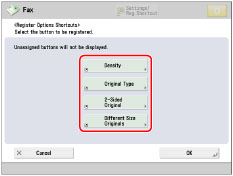 Four options shortcuts are displayed on the Fax Basic Features Screen. [Density], [Original Type], [2-Sided Original], and [Different Size Originals] are displayed as default. These shortcuts can be changed to functions that you frequently use.