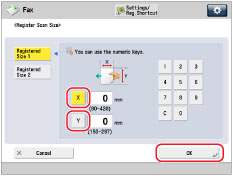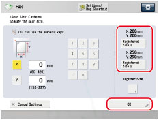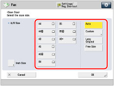 You cannot select [Auto] when scanning the following types of originals. Select the desired scan size. Nonstandard size originals Highly transparent originals, such as transparencies Originals with an extremely dark background Originals smaller than B6 or B6R B6 originals placed in the feeder B6R originals placed on the platen glass If you send a fax in the Manual Sending mode and place your originals in the feeder, the Scan Size setting that you specify will not be used. Take note of the following when you set [Custom]: Place your originals on the platen glass. Sent images are not rotated. Take note of the following when you set [Long Original]: Place your originals in the feeder. You can only set a zoom ratio of 100%. Take note of the following when you set [Free Size]: Place your originals in the feeder. |