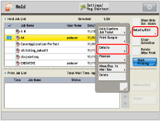 Select the desired job from the Hold Job List → press [Details/Edit] → [Delete].