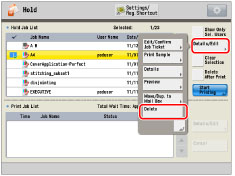 Select the desired job from the Hold Job List or the Print Job List → press [Details/Edit] → [Details].