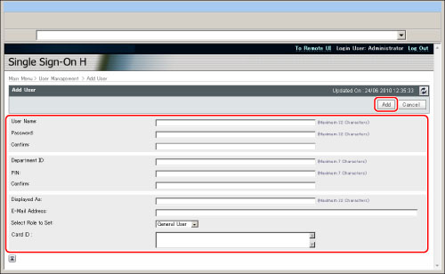 A maximum of 5,000 users can be registered. You cannot change the user name. If you edit user data when that user is logged in, the changes you made are validated only after that user is logged out. If you want to change the user name, you must delete the user data, create, and register new user data. The user data that is logged in as the System Administrator (Administrator) cannot be deleted. Imported user data is registered or overwritten as the general user. User type of all exported data is saved as the general user. |
