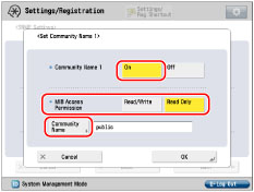 Press [On] for <Use SNMPv1> → [Dedicated Comm. Settings]. Press [On] for <Dedicated Community> → [Read/Write] for <MIB Access Permission>.