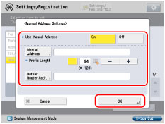 Press [Manual Address] → enter the IPv6 address → press [OK]. Enter the prefix length for the IPv6 address in [Prefix Length].
