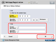 Press [DNS Server Address Settings] for [DNS Settings] → specify the following items in <IPv6> → press [OK].