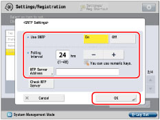 Press [SNTP Settings] for [TCP/IP Settings] → specify the following items → press [OK].