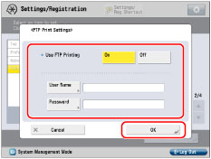 Press [FTP Print Settings] for [TCP/IP Settings] → specify the following items → press [OK].