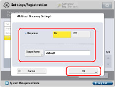 Press [On] for <Response> to use device information from other machines, such as an Address Book or Department ID Management settings, or respond to a multicast discovery from utilities.