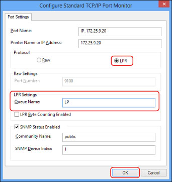 Select [LPR] in [Protocol] → enter the print queue name in [Queue Name] in [LPR Settings] → click [OK].
