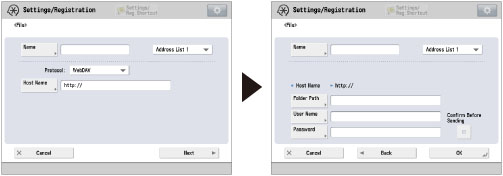 Up to 128 alphanumeric characters can be entered for [Host Name] on the control panel. Also, up to 255 alphanumeric characters can be entered for [Folder Path]. Specify the server settings within the character limits. If you change the language of the touch panel display, [Host Name] and [Folder Path] may not appear correctly. If the language of the touch panel display differs from the computer used as a master browser, [Host Name] and [Folder Path] may not appear correctly, or you may not be able to browse the directories. To send to an IPv6 host, set [Host Name] using the following format: <IPv6 address>:<Port number> Example: [5aed:90a0:bc05:01d2:568a:2fc0:0001:12ee]:21000 |