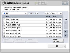 When you press [Paper Type Management Settings], the following screen appears. In this screen, you can register and edit detailed information of frequently used paper types as the custom paper type.