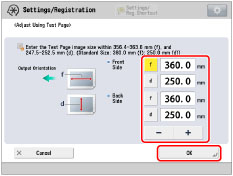 For example, if the measured length of [f] is 360.4 mm, enter 360.4. The difference in length (0.4 mm in this case), is reduced, so that the image is printed in the correct size.