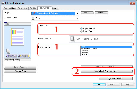 1. Specifying the Paper | When you want to print on a specific type of paper, specify the paper source containing the paper, or the paper type. | 2. Front/Back Covers | Uses different paper for the front and back covers from that used for the main body copy. |