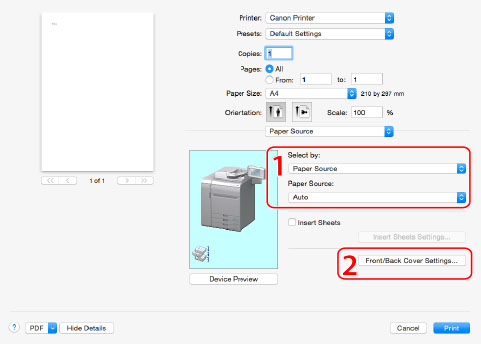 1. Paper Source | When you want to print on a specific type of paper, specify the paper source containing the paper, or the paper type. | 2. Front/Back Covers | Uses different paper for the front and back covers from that used for the main body copy. |