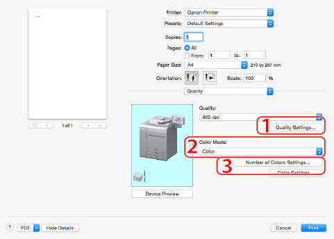 1. Quality Settings | Enables you to configure settings relating to print quality. | 2. Black and White Printing | Prints color documents in black and white (see "Setting the Color Mode for Printing"). |