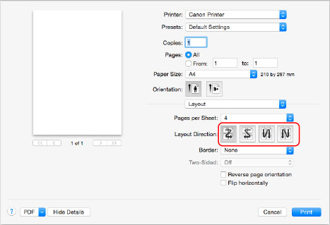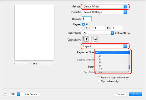 Select your printer → [Layout] →the number of pages you want to print onto one sheet of paper from [Pages per Sheet].