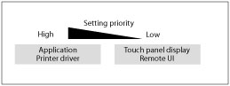 The most recently specified settings take priority for settings available only on the touch panel display or Remote UI.