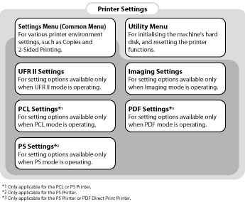 For instructions on specifying the menu settings on the Remote UI, please refer to "Remote UI."The contents of the Printer Settings are stored in the nonvolatile memory of the machine. This means that the settings are stored even if the power to the machine is switched OFF, and therefore the settings will still be available when the power is switched ON again. |