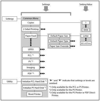 The Printer Settings menu enables you to access common features. Below is an abbreviated outline of the Printer Settings menu structure.