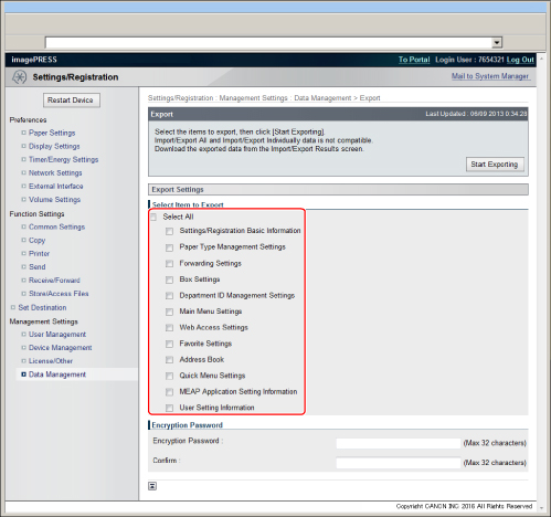 The Remote UI enables you to select and save (export) the settings information. You can also select and save the specific items or save all items as one item.