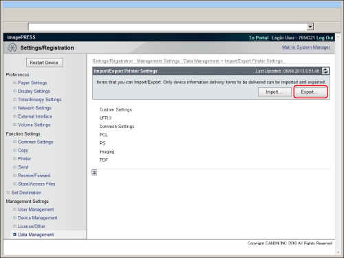 Click [Printer Settings] for <Import/Export Individually> → [Export...].
