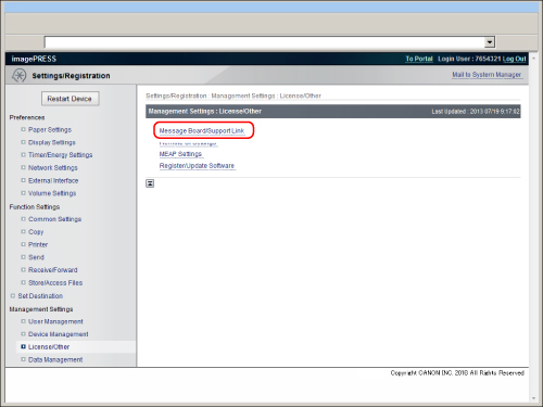 Click [Settings/Registration] → select [License/Other] from the menu that appears under Management Settings → click [Message Board/Support Link].
