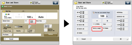 This mode enables you to enlarge or reduce originals by individually entering the dimensions of the original and output paper. You can set a copy (zoom) ratio from 25% to 400% if you place the original on the platen glass, or from 25% to 200% if you place the original in the feeder.