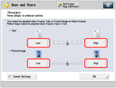 To scan text or lines clearly, the setting should be towards [High] for <Text>. To scan originals containing printed photographs or other halftones, the setting should be towards [Low] for <Photo/Image>.