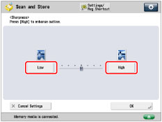 To scan text or lines clearly, the setting should be towards [High]. To scan originals containing printed photographs or other halftones, the setting should be towards [Low].