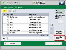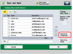 If you perform a new destination search when a search result is already displayed on the destination list screen, the displayed search result is cleared. If the search result for specified criteria is displayed, the search result is cleared and search for all criteria is processed when you press [All]. If you set [Auto Search When Using LDAP Server] to 'Off', nothing appears on the destination list screen until you perform a search. If the search result from [Search by Conditions] is displayed on the search list screen, you cannot additionally press [Search by Name] to narrow the search by name. If a destination is registered with an e-mail address and a fax number, you can search for the e-mail address by entering the fax number as the search criterion, and vice versa. |