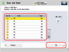 Only one mail box can be specified as the destination at a time. To be able to send a link to a mail box via e-mail, it is necessary to first register an e-mail address for the mail box. (See "Mail Box Settings.") If the URL Send mode is set, you cannot send to a group address that includes a mail box as a destination. |