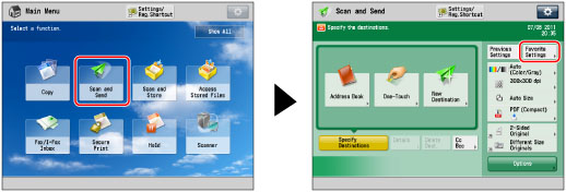 To use this feature, you must first register the desired document settings and destinations in a favorite settings button. For instructions on registering destinations and settings in a favorite settings button, see "Registering/Editing Favorite Settings." |