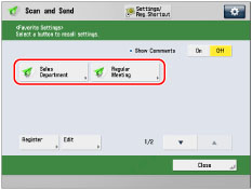 You can manually change the settings recalled from the selected button before you send your documents. If multiple destinations are stored in the selected button, the destinations may not be listed in the order in which they were set. The destinations registered in the one-touch buttons stored in the favorite buttons of the client machine are not updated even if those registered in the one-touch buttons of a server machine are updated. Confirm if the destination is updated when you cannot send to the registered destinations. |